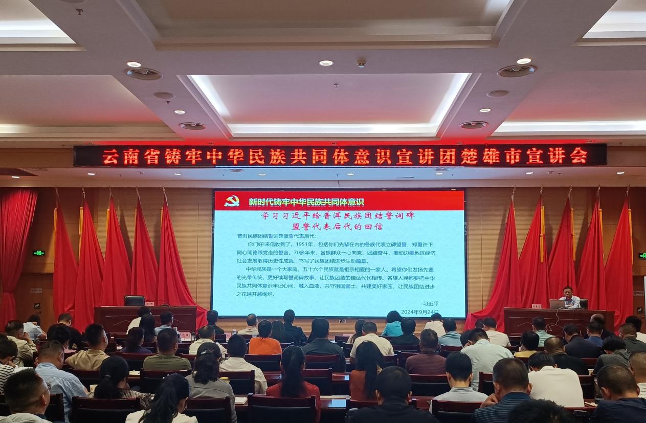 为深入学习宣传贯彻习近平总书记关于加强和改进民族工作的重要思想以及习近平总书记给普洱民族团结誓词碑盟誓代表后代回信精神,贯彻落实省委关于把铸牢中华民族共同体意识作为云南各项工作主线的要求,加快构建铸牢中华民族共同体意识宣传教育常态化机制,9月27日,云南省铸牢中华民族共同体意识宣讲团楚雄市宣讲会在楚雄市委党校举行,各乡镇设置分会场参加。
