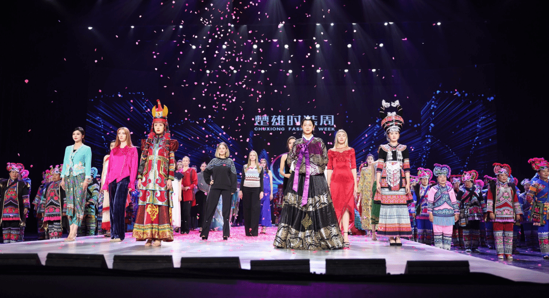 楚雄时装周作为楚雄彝绣延伸发展的非遗品牌。2023年,首届楚雄时装周成功举办,吸引7国、国内6省区及云南16州市的24支代表队参与,呈现1100余套服饰、举办39场专场发布,迅速确立其在中国非遗时尚领域的重要地位。2024年,第二届楚雄时装周实现跨越升级,在北京中轴线举办“非遗彝绣秀北京”大型展演,并首度登陆巴黎时装周举办非遗专题展览,实现楚雄、昆明、北京、巴黎四城联动。活动获得美联社、法新社等160余个国家主流媒体的广泛报道,两届时装周全球传播量突破34.7亿次,国际能见度与品牌影响力大幅提升。2025年6月,楚雄时装周升级版——“丝路云裳·南博时装周”亮相第九届中国—南亚博览会,来自南亚东南亚8个国家及省内外多个代表团举办35场服饰走秀。