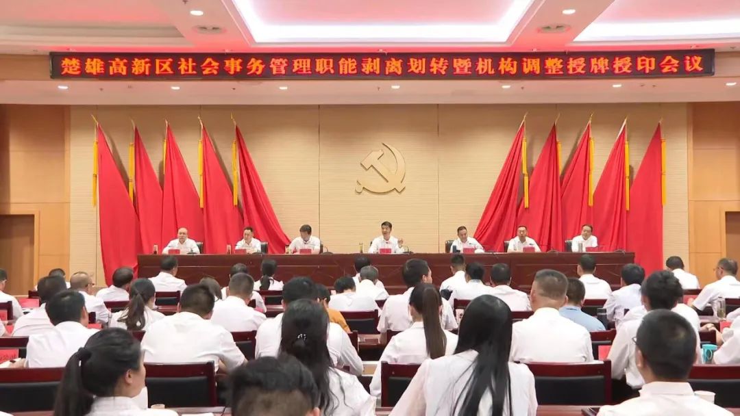 2023年4月21日,楚雄高新区社会事务管理职能剥离划转暨机构调整授牌授印会议召开,对楚雄高新区社会事务管理职能剥离划转工作进行再部署,对机构调整工作进行再安排。州委常委、楚雄市委书记、楚雄高新区党工委书记冯毅出席会议并讲话,楚雄市委副书记、市长、楚雄高新区管委会主任罗兴贵主持会议。