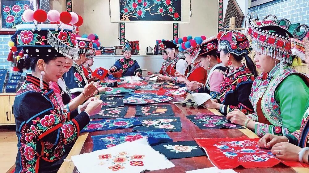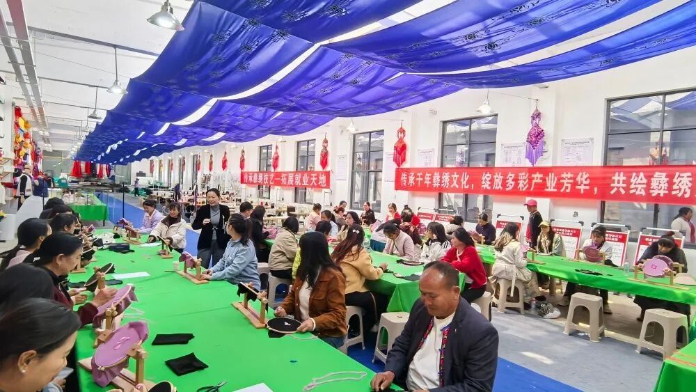 针对过去绣娘“散、弱、小”的痛点,楚雄市创新探索“组织化动员、标准化建点、精准化联结”模式。建立“龙头企业+车间主任+经纪人+绣娘”四级联动体系,将7010名绣娘纳入动态管理的“能力档案网”。整合新时代文明实践所(站)、闲置资产等资源,在全市16个乡镇(街道)建成规范化彝绣车间,形成了“乡镇有车间、村级建绣坊”的阵地格局。更值得一提的是,该市推行“龙头企业联乡带村”全覆盖模式。咪依噜、彝彩文化、索玉文化、彝绣天地等重点龙头企业分片联系全市16个乡镇(街道),派出专门力量下沉指导车间建设、派发订单、培训绣娘,确保每个车间不“空转”,让产业触角真正延伸到村村寨寨。