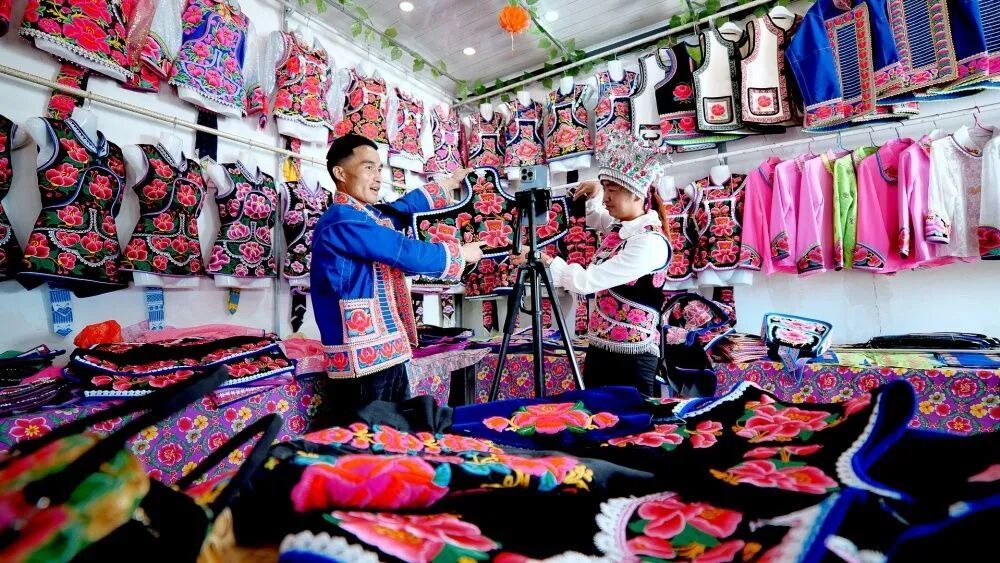 楚雄市深耕设计、生产、销售全链条,推动彝绣向品牌化、精品化、市场化升级。设计端联合高校开展AI纹样创新与数字化建设,为传统技艺注入科技动能;生产端推行团体标准,构建 “手工精作、手推量产、机绣扩能” 协同体系;销售端布局一线市场、培育30余名 “绣娘主播”,2025年线上销售额破2400万元,产品远销海外。