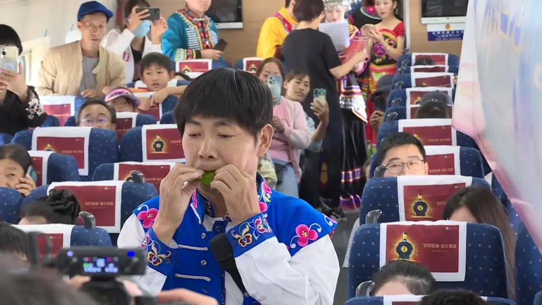 在列车上,楚雄州民族艺术剧院的演员们用土粱、直笛、阿乌、葫芦丝等几种各具特色的云南地方少数民族乐器,为广大游客演绎了彝族人民的热情好客,最后,集体跳起《七月火把节》,点燃了大家的激情。