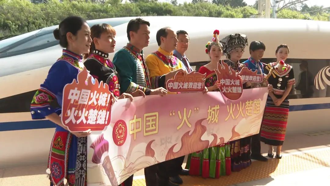 8月9日上午8时20分,昆明至楚雄开行的首趟“火把节”高铁专列从昆明南站发车,载着1000余名游客直达楚雄,楚雄市委副书记、市长罗兴贵来到楚雄高铁站,带头向游客宣传推介楚雄,真诚欢迎八方游客来到楚雄,共同欢度楚雄彝族火把节。
