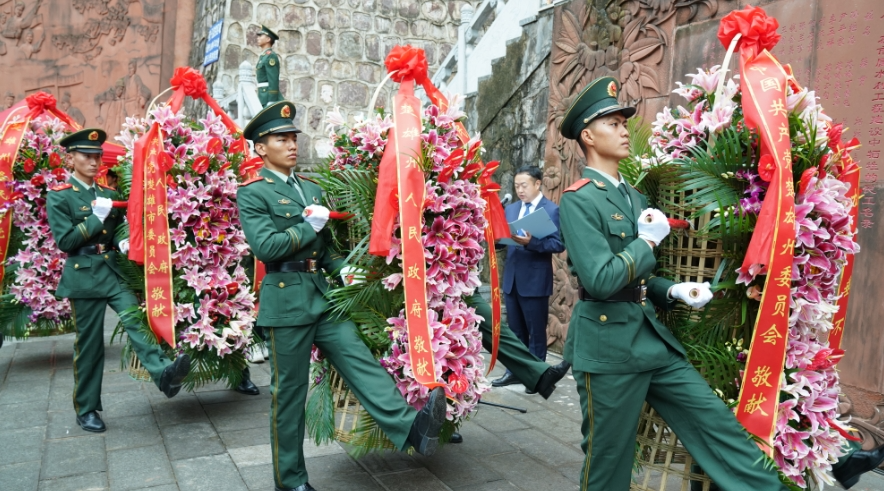 在深情的《献花曲》中,礼兵护卫着由州委、州人大常委会、州人民政府、州政协、驻楚解放军和武警部队、楚雄市委市政府,全州各民主党派、各族群众、中国少年先锋队、烈士遗属、英模、劳模代表敬献的花篮,缓步走向英烈墙,敬献花篮。