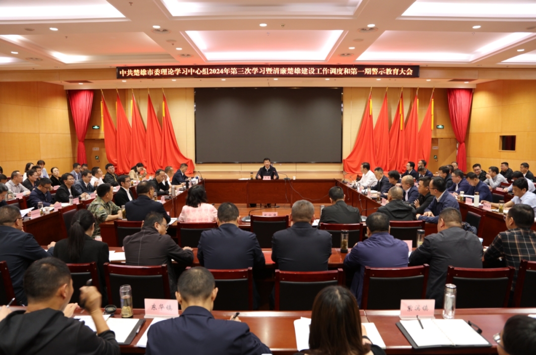 2024年4月1日,中共楚雄市委理论学习中心组举行2024年第三次学习暨清廉楚雄建设工作调度和第一期警示教育大会。强调,要深入学习贯彻习近平总书记关于党的建设、党的自我革命的重要思想,全面贯彻落实中央、省、州有关会议精神,坚持党要管党、全面从严治党,坚持警示教育在先、纪法提醒在先,从严监督管理干部,坚决防治和纠治“新形象工程”,推动党政机关习惯过紧日子,持续深化清廉楚雄建设,为全面推进中国式现代化楚雄市实践提供坚强保障。