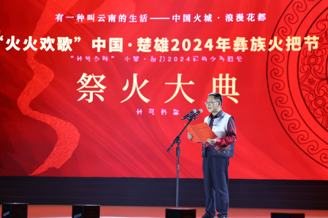 火把有信、花开如约。张文旺致辞并宣布祭火大典开始。张文旺表示,近年来,楚雄州各族人民始终牢记嘱托、感恩奋进,担负起了滇中崛起增长极的历史使命,呈现了“争奇斗艳”的美丽花海、“繁花似锦”的发展景象、“团结干事”的奋斗图景,全州上下铸牢中华民族共同体意识深入人心,民族团结进步之花绚丽绽放。“幸福楚雄”彰显在城市乡村相得益彰、宜居宜业的生活环境里,跳动在生活事业均可兼得、无缝衔接的多元追求里,体现在社会保障优质均衡、可感可及的民生温度里,洋溢在“一老一小”生活舒心、精神丰盈的社会氛围里。今天,我们欢聚“中国火城 浪漫花都”,共同传承生生不息的文明之火,共同见证欣欣向荣的繁花盛景,共同体验美美与共的幸福生活。让我们点燃象征丰收与幸福的圣火,共同祝愿楚雄的明天如火绚烂、如花绽放,祝愿我们伟大的祖国山河锦绣、国泰民安。