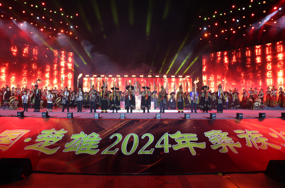 中国火城,星火璀璨。7月27日晚,“火火欢歌”中国•楚雄2024年彝族火把节祭火大典在中国彝族十月太阳历文化园举行。