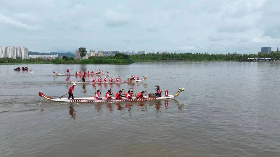 伴随着裁判员一声令下,鼓声响起,身着各色队服的龙舟队员奋力舞动着手中的船桨,喊着号子奋力划水,一条条龙舟你追我赶,飞驰向前,场面十分壮观。