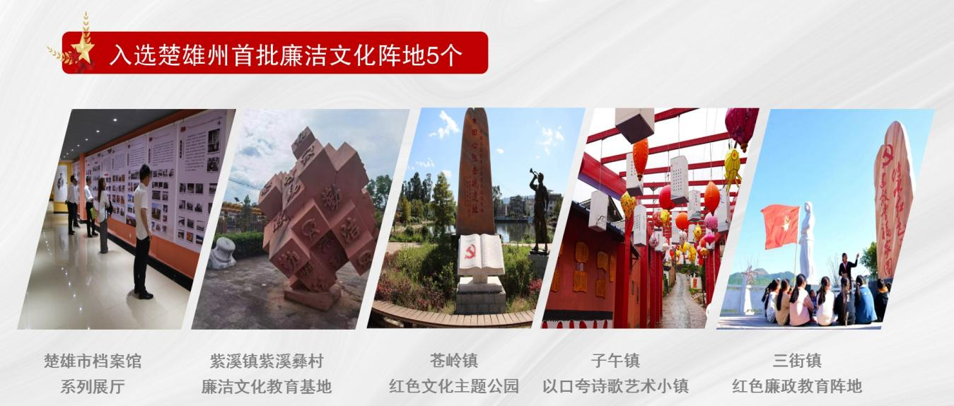 ——坚持在阵地建设中夯实清廉之基。阵地建设是传播廉洁文化的重要基础工作。楚雄市坚持因地制宜和守正创新相结合,用好用活“威楚红色文化走廊”等阵地资源,植入“廉洁元素”,挖掘廉洁故事,建立了由45个场所构成的楚雄市廉洁文化阵地目录,楚雄市档案馆系列展厅、紫溪镇紫溪彝村廉洁文化教育基地、苍岭镇红色文化主题公园、三街镇红色廉政教育基地、子午镇以口夸诗歌艺术小镇5个阵地确定为楚雄州州级廉洁文化阵地,占全州总数的20%。通过有形阵地建设,廉洁文化的教化功能得到充分发挥。强化“清廉细胞”建设,把“清廉村居”建设与学习运用“千万工程”经验有机结合,建好用好农村新时代文明实践所(站),大力推进农村精神文明建设和移风易俗,推动廉洁文化融入基层治理。