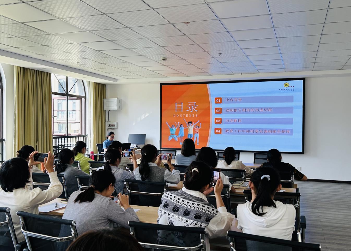 万丽同志主要从强制报告制度的出台背景、形成历程、内容解读及教育工作中如何落实强制报告制度等四个方面进行了阐述,并应用扎实的法律专业知识、丰富的实证案例及典型的未成年人被侵犯视频,为教职工生动地呈现了这部法律制度。