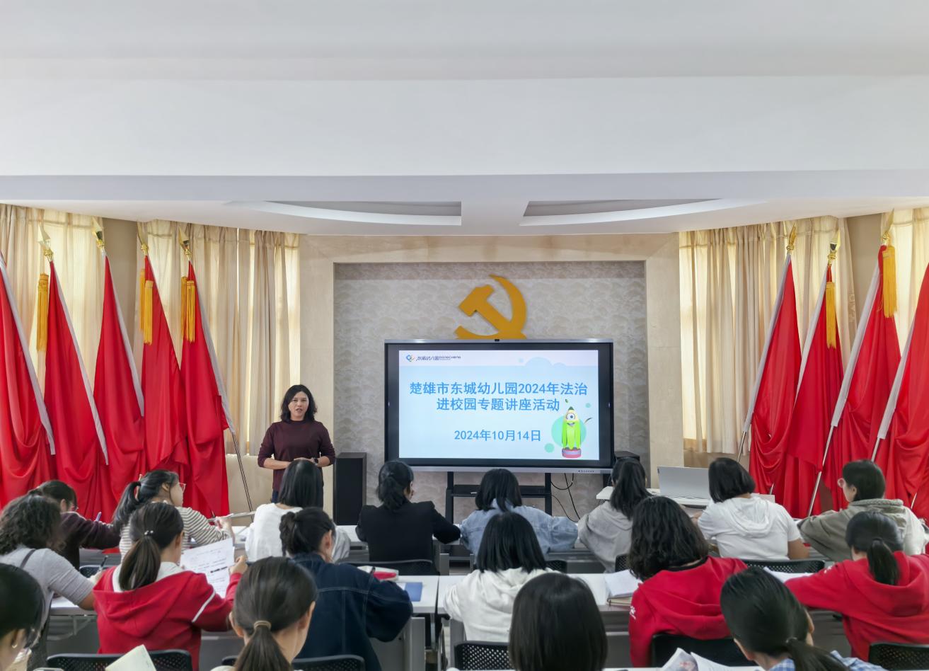 10月14日、15日中午,楚雄市东城幼儿园邀请楚雄市人民检察院检察官、楚雄市东城幼儿园法治副校长万丽分别为本部及分园的教职工开展了主题为“落实强制报告制度撑起未成年人‘保护伞’”2024年法治进校园专题讲座活动。