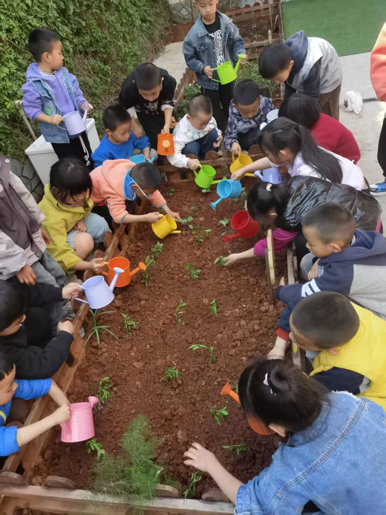 大班孩子们在老师们的带领下,化身“小小播种员”,亲手将一粒粒充满希望的种子播撒在幼儿园的种植园地里。他们小心翼翼地挖坑、播种、填土、浇水,每个步骤都做得认真细致,脸上不时洋溢着兴奋和期待的笑容,带着孩子们的美好愿望,期望花生、向日葵等小小种子及辣椒、茄子等小秧苗在土壤里生根发芽,快乐生长。