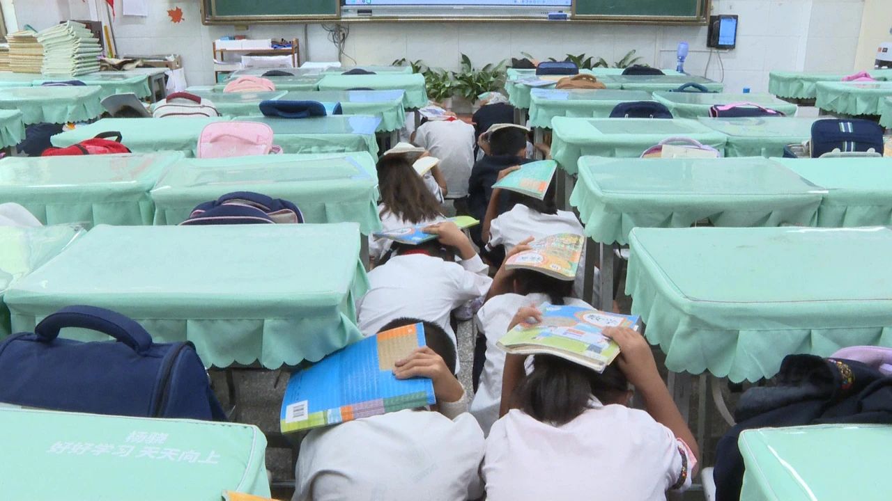 随着第一声警报响起,正在上课的师生迅速反应,就近躲在课桌下避震,用双手拿书本护住头部。随后,大家弯腰低姿、用书本护头,沿着预定疏散路线,快速有序地撤离至操场安全区域。