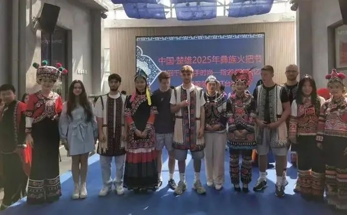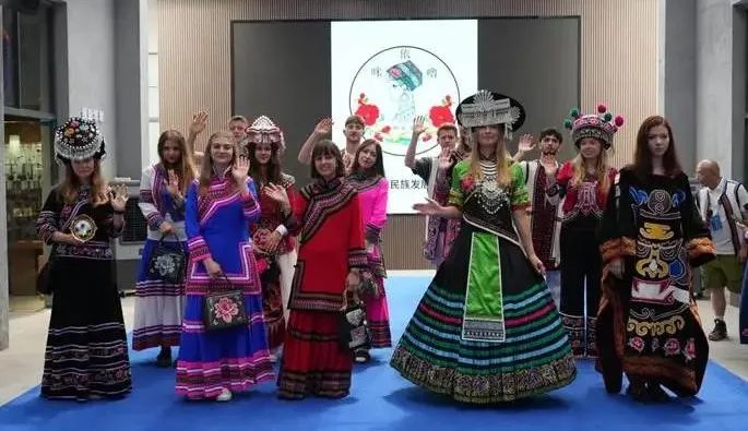 2025年7月20日,正值云南楚雄2025年火把节盛会之际,楚雄市万家坝•记忆楚雄“梦回千年牵手时尚指尖上的技艺彝绣动态展”迎来了一批特殊的国际友人——德国伯乐中文合唱团的师生们走进楚雄彝绣馆,在非遗传承人的带领下,不仅近距离观赏了被誉为“穿在身上的史诗”的彝绣珍品,更穿上华美的彝族服饰,亲身体验彝族T台走秀,以沉浸式互动为中西文化交流谱写动人篇章。