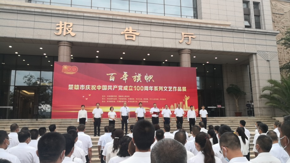 翰墨飘香,丹心颂党。6月28日上午8点30分,由中共楚雄市委、楚雄市人民政府主办,市纪委市监委、市委宣传部、市委党校、市总工会、市文联、市工人文化宫、市档案馆承办,市作家协会、市摄影家协会、市书法家协会、市美术家协会协办的“百年旗帜——楚雄市庆祝中国共产党成立100周年系列文艺作品展”,在市委党校报告厅正门前小广场举行,开展仪式由市委副书记、市人民政府常务副市长袁培林主持,市委副书记、市人民政府市长杨俐昆致辞,州委常委、州政协副主席、楚雄市委书记冯毅宣布开展。
