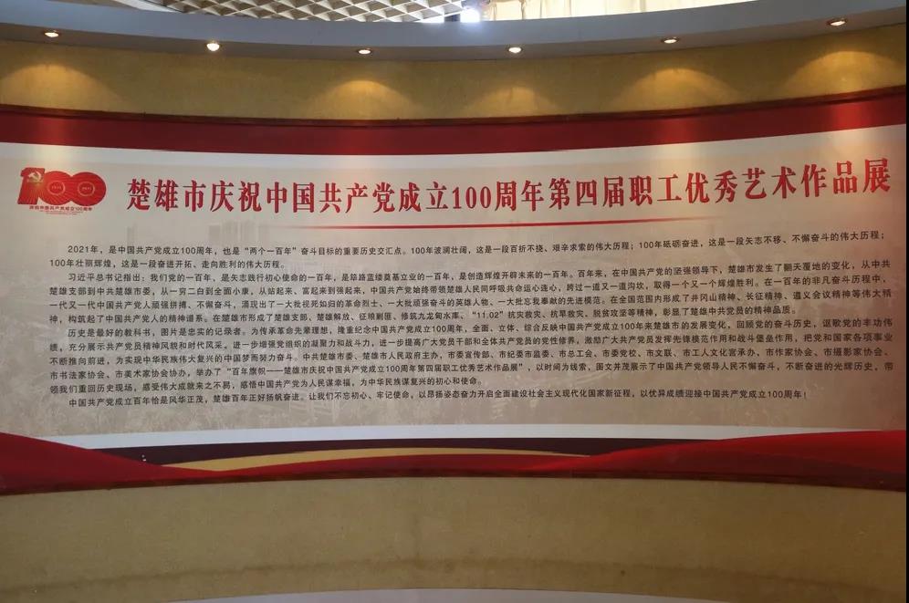 第四届职工优秀艺术作品展开展是系列文艺作品展中的一个部分,展览共收到各类作品1万余件,通过专家评委会严格的评审、遴选,共选出200余件佳作,组成“百年旗帜——楚雄市庆祝中国共产党成立100周年第四届职工优秀艺术作品展”,在楚雄工人文化宫四楼展厅展出,观展时间为6月28日至7月15日。本次展览,旨在庆祝中国共产党成立100周年,进一步增强党组织的凝聚力和战斗力,弘扬祖国传统文化,打造健康文明、昂扬向上的职工业余文化生活