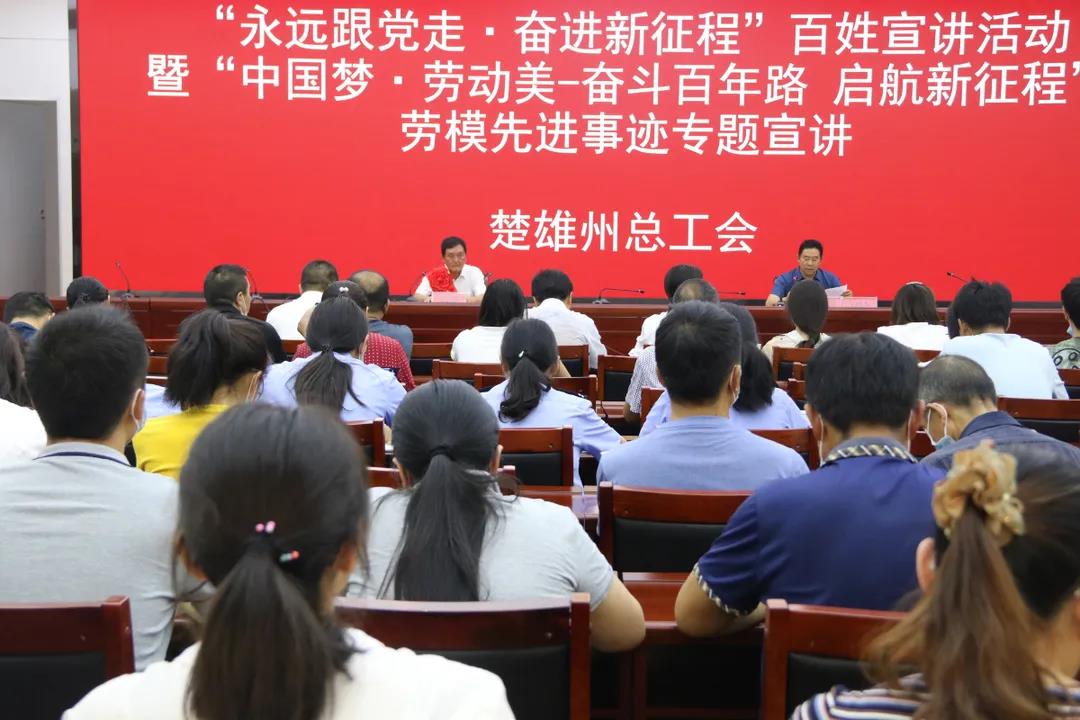 6月24日,由楚雄州、市总工会组织的党史学习教育劳模事迹宣讲报告会在楚雄市政务服务管理局举行。报告会邀请楚雄北浦中学原校长姜云秋,云南摩尔农庄生物科技开发有限公司生产线车间主任谢德飞两位劳动模范进行宣讲。来自楚雄州、市机关企事业单位的200余名干部职工及工会会员参加。州总工会常务副主席高翔主持本次宣讲报告会并为报告会致辞。