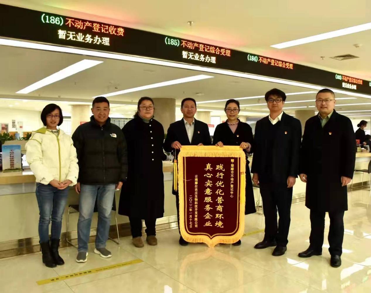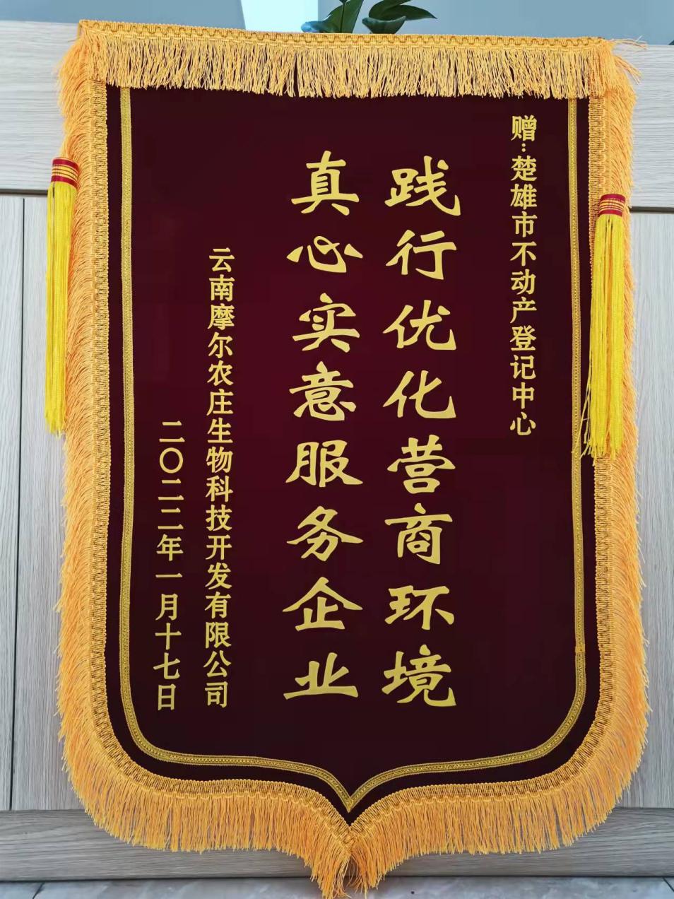 2022年1月18日,云南摩尔农庄生物科技开发有限公司将一面印有“践行优化营商环境真心实意服务企业”的锦旗送到了楚雄市不动产登记中心,对该中心全体干部职工爱岗敬业、热情周到、高效便民利企的优质服务表示高度赞扬和诚挚感谢。