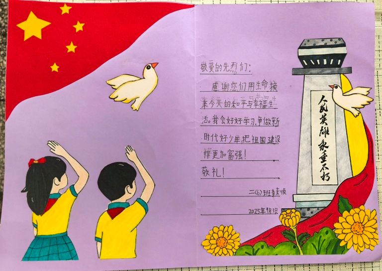 ——给抗战先烈写一封信。“写给抗战先烈的一封信”活动也在全校范围内广泛开展。一二三年级用图画配短句、贺卡传递缅怀,四五六年级撰写书信表达敬意。学生们用稚嫩的笔触,真挚的情感,书写着对先烈们的敬仰和怀念。信中,有的学生表达了对先烈英勇无畏精神的赞美,有的诉说着自己在和平年代的幸福生活,感谢先烈们的付出,还有的立下志向,要努力学习,长大后报效祖国。一封封书信,承载着学生们对先烈们的无限敬意和对未来的美好憧憬。