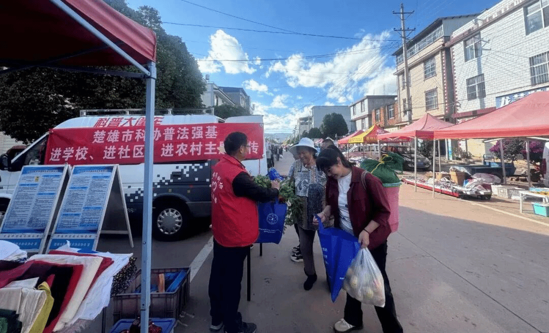 当天的苍岭镇集镇热闹非凡,赶集的群众背着背篓、提着刚采购的农产品穿梭在摊位间,楚雄市科协的红色志愿马甲在人群中格外醒目。科普大篷车停在集市入口,“普法强基进学校、进社区、进农村”的宣传标语迎风招展,志愿者们忙着向过往群众发放科普手册、环保宣传袋,结合展板讲解农业科技、法律维权、健康生活等实用知识。