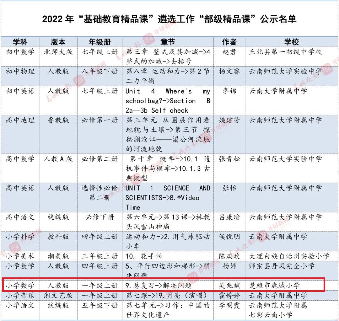 3月13日,教育部办公厅发布《关于2022年“基础教育精品课”遴选工作“部级精品课”名单的公示》,其中楚雄市鹿城小学吴兆斌老师的小学数学《总复习→解决问题》精品课入选。