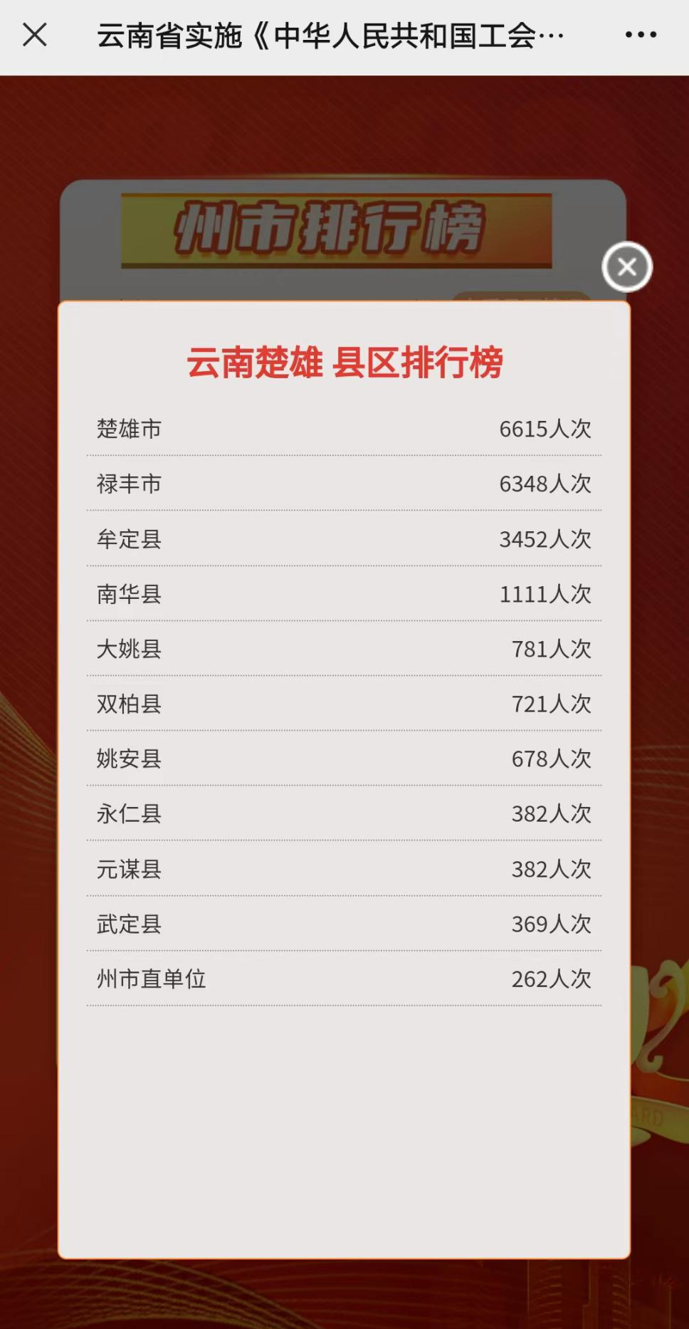 ——多措并举,普法工作初见成效。积极组织全市职工参加第一轮云南省职工学习《云南省实施〈中华人民共和国工会法〉办法》网络答题活动。在全市职工的共同努力下,楚雄市累计答题6615人次,位列全州第一,极大地激发了职工自学的热情,迅速在全市范围内掀起学习热潮。并认真贯彻落实“国家级开发区可以探索建立总工会”的相关规定,市总工会统筹协调,指导楚雄高新区成立区总工会。