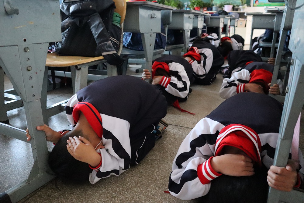 上午9:00,随着地震警报的响起,全体同学迅速将凳子放入课桌下面,跪伏于课桌旁,一只手扶住课桌,一只手护住颈部。教师立即检查教室门是否打开,并蹲下身子用手扶住教室门,确保出口通畅。