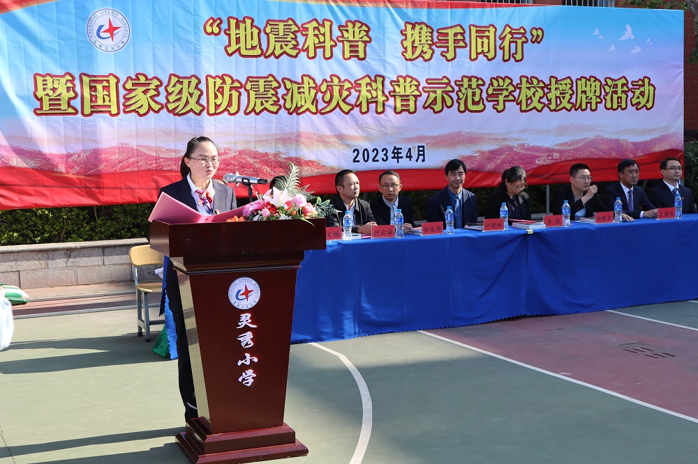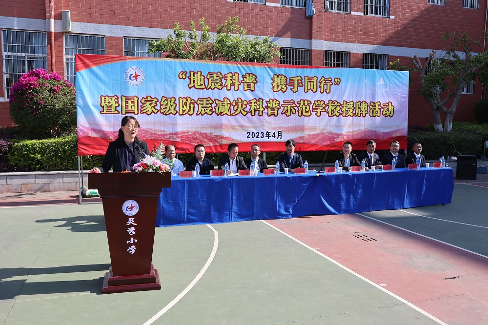 最后,楚雄市灵秀小学校长甘清梅作了表态发言,并表示灵秀小学将以此为新的起点,充分发挥防震减灾科普示范学校的引领作用,扎实开展防震减灾科普工作,提高灾害防治能力,持续构筑生命安全防线,努力开创防震减灾工作新局面。