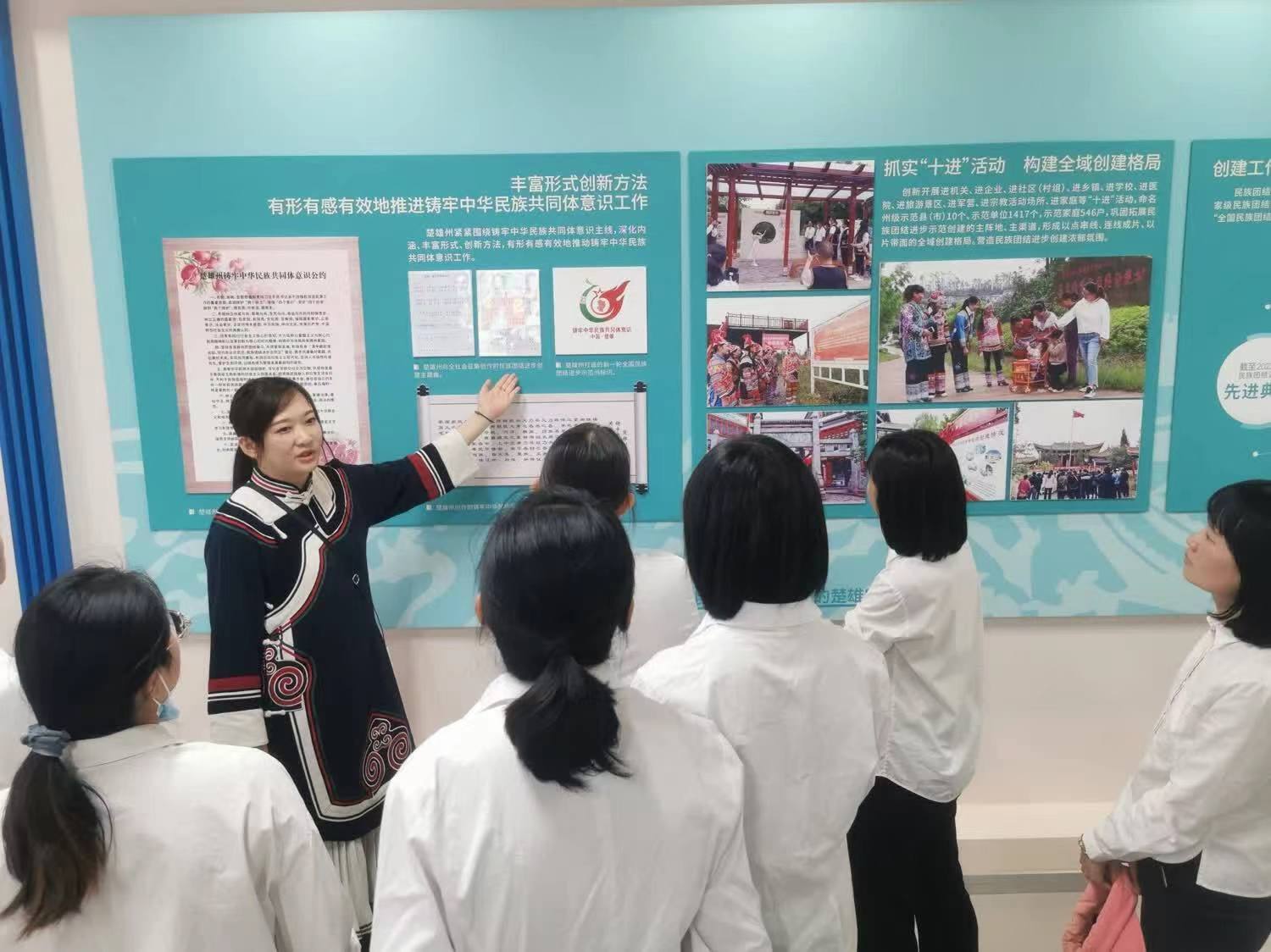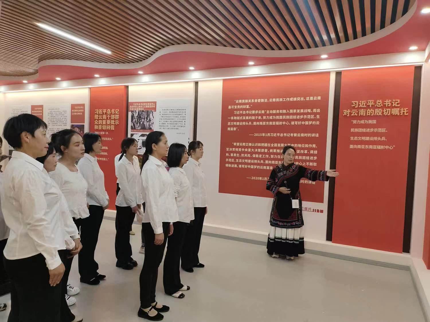 主题教育中,全体教师认真聆听讲解员对国家民族政策的讲解及习近平总书记对云南的殷切嘱托。