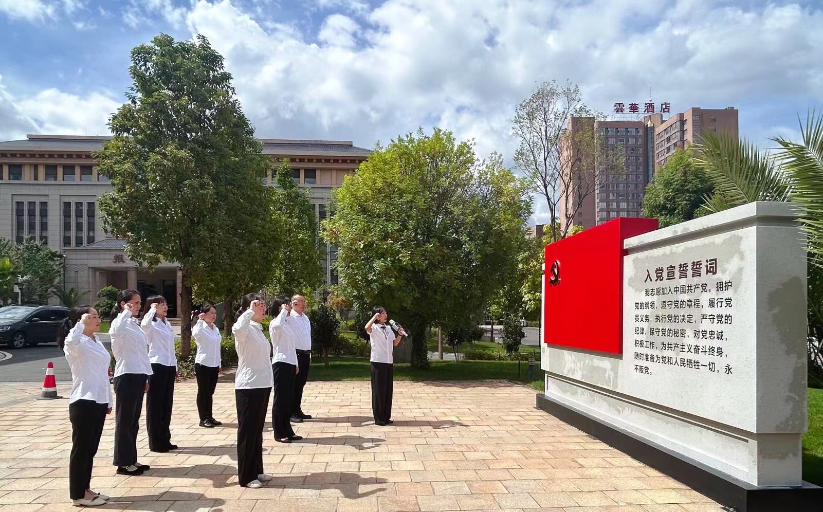 ——重温入党誓词。在庄严的党旗下,大家又一次慎重的举起右手,庄严宣誓,理想信念、党性意识得到进一步加深。