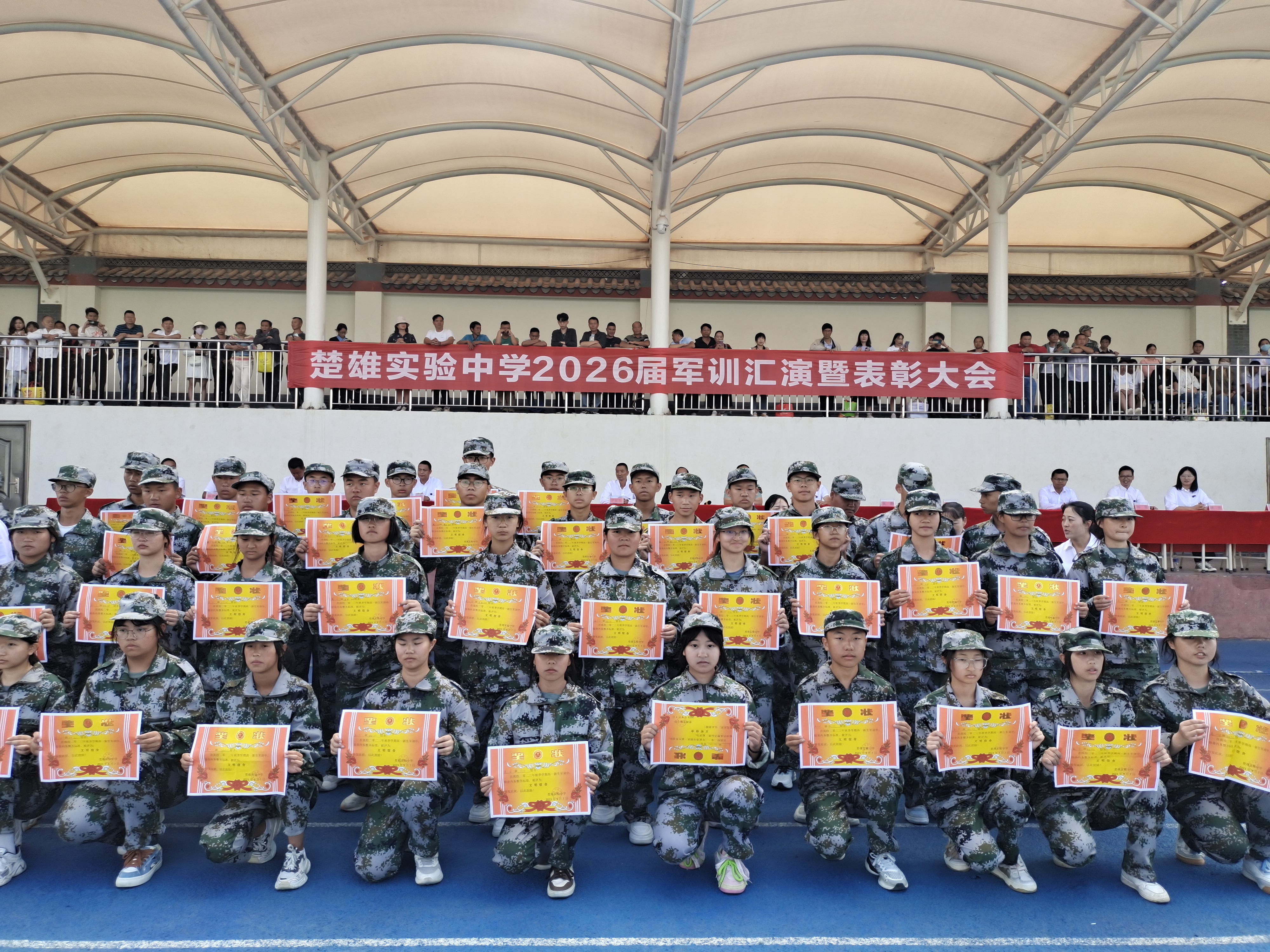 “开学第一天就是军训。军训虽然很苦很累,但也是我们人生中的一次考验,军训锻炼了我们的意志品格,增强了我们的国防观念,激发了我们的爱国热情,让我们明白了什么是责任担当,什么是团队意识。”9月7日,在楚雄实验中学举行的2026届新生国防教育综合检验汇报展示中,该校高一3班学生鲁怡云同学说。