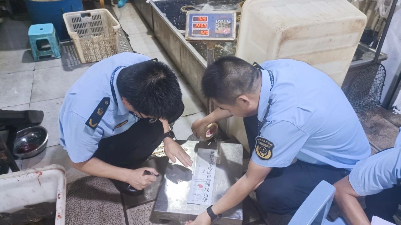 本次专项突击检查围绕农贸市场“缺斤少两”易发点位,重点检查了市场水产经营户使用的计量器具是否在检定合格有效期内、是否粘贴检定合格标识、有无使用“作弊秤”等,执法人员按照检定规程,利用标准砝码对水产摊位使用的8台电子计价秤的示值误差进行逐台检定,对检查中发现的问题现场进行处理。