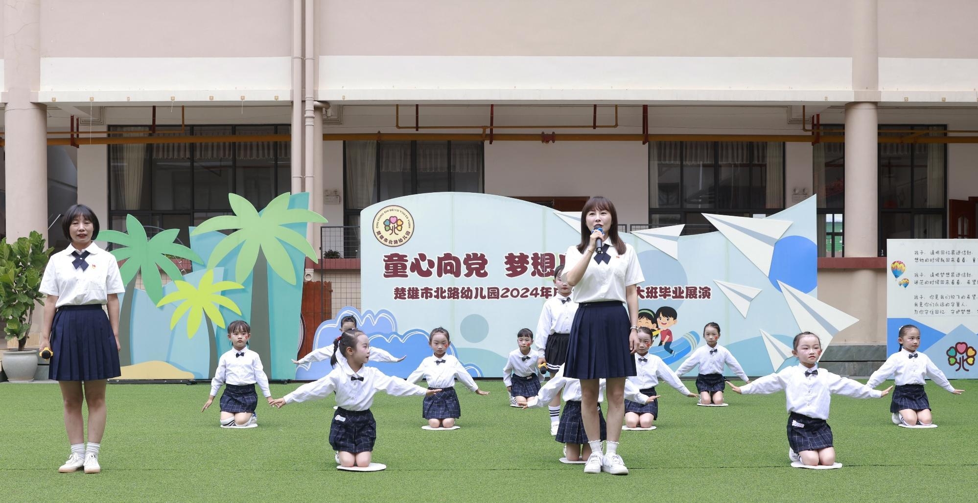 在楚雄市北路幼儿园“童心向党 梦想启航”庆“七一”暨大班毕业展演中,党员教师和小朋友们以诗歌和表演结合的方式展现了原创诗朗诵《赓续红色血脉 星星之火燎原》,在其中渗透红色教育。