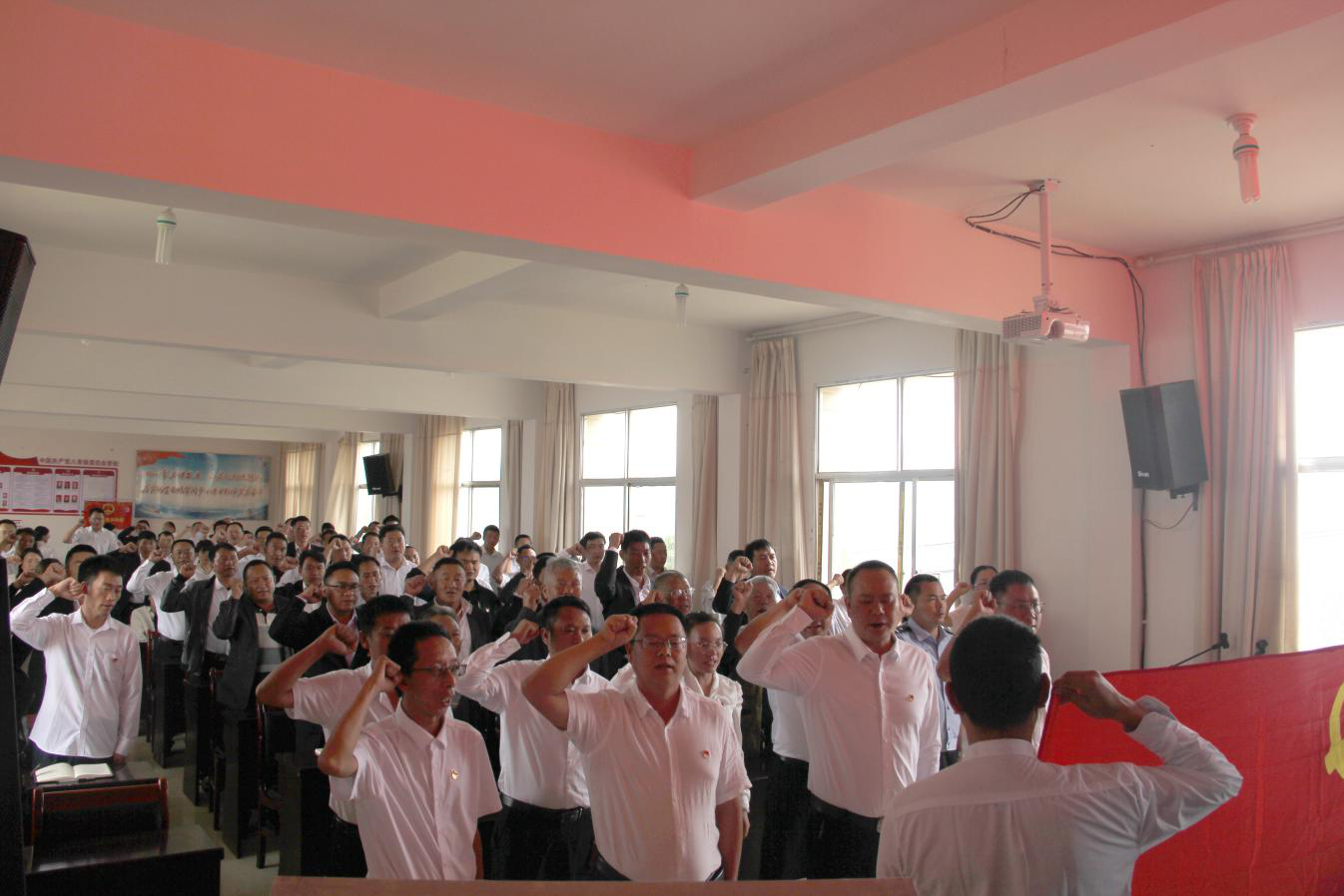 大会正式开始之前,镇党委书记刘天阳带领全体党员重温入党誓词。