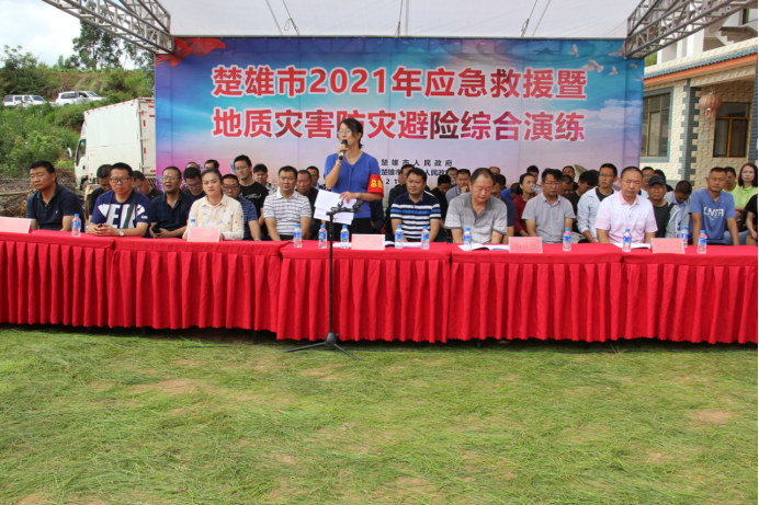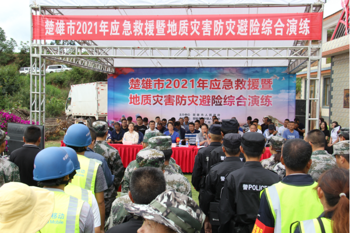 为有效预防地质灾害发生,保障群众生命财产安全,7月9日上午,楚雄市2021年应急救援暨地质灾害防灾避险综合演练在子午镇挖铜村委会杜家村民小组举行。子午镇党政班子成员,各办公室、中心、站所参加演练人员,村委会主任,地质灾害隐患点监测员及当地群众共140余人参加演练。市领导胡乃林、李英及市级20个相关单位负责人、15个乡镇主要领导到现场观摩。