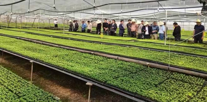 (图为镇村干部观摩工业辣椒苗圃现场)