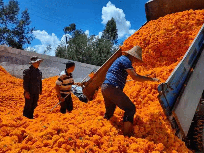 万寿菊是一年生草本植物,含有丰富的叶黄素,能够延缓老年人因黄斑退化而引起的视力退化和失明症,以及因机体衰老引发的心血管硬化、冠心病和肿瘤疾病。万寿菊提炼出的叶黄素,还广泛应用于眼药水、化妆用品的绿色添加剂,市场前景广阔。在种植基地里,连片的万寿菊迎风摇曳,村民们正忙着采摘成熟的花朵,田间地头处处洋溢着丰收的喜悦。万寿菊因其种植成本低、难度小、抗风险能力强等特点,深受当地农户青睐。相比传统玉米种植,万寿菊的收益高出3倍,在提升群众收入的同时,也极大地美化了乡村环境,兼具经济效益与生态效益。