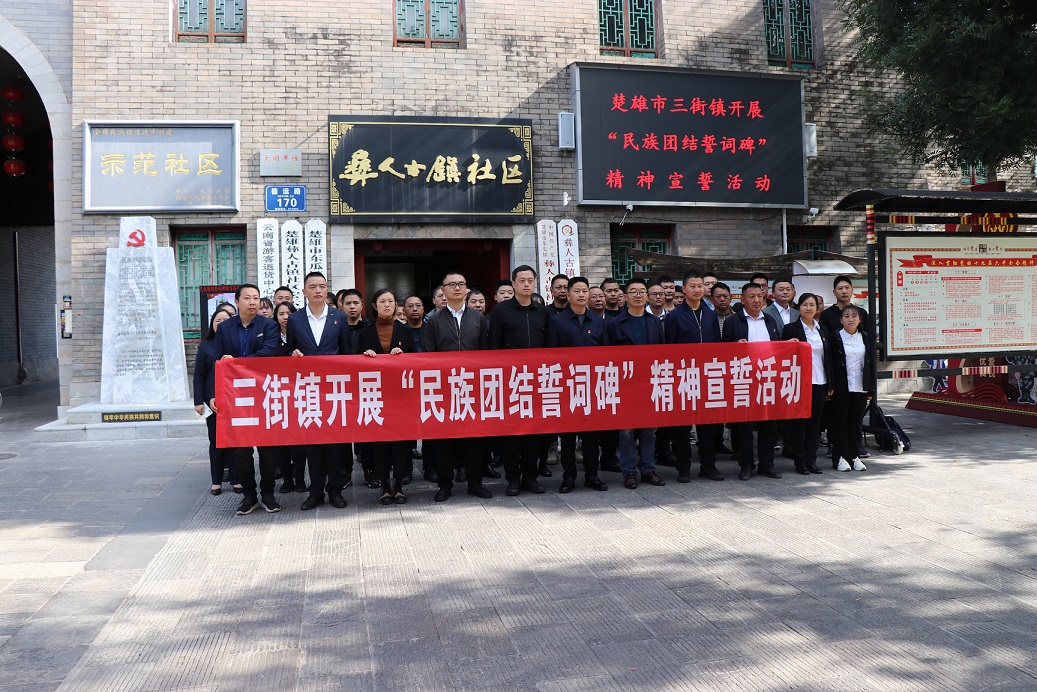 为加强民族团结进步宣传教育,促进各民族交往交流交融,铸牢中华民族共同体意识,引导广大干部职工传承弘扬坚定不移跟党走、团结奋斗建家园、同心共筑中国梦的“民族团结誓词碑”精神。2022年11月5日,三街镇组织全体干部职工到东瓜镇彝人古镇社区开展“民族团结誓词碑”精神宣誓活动。