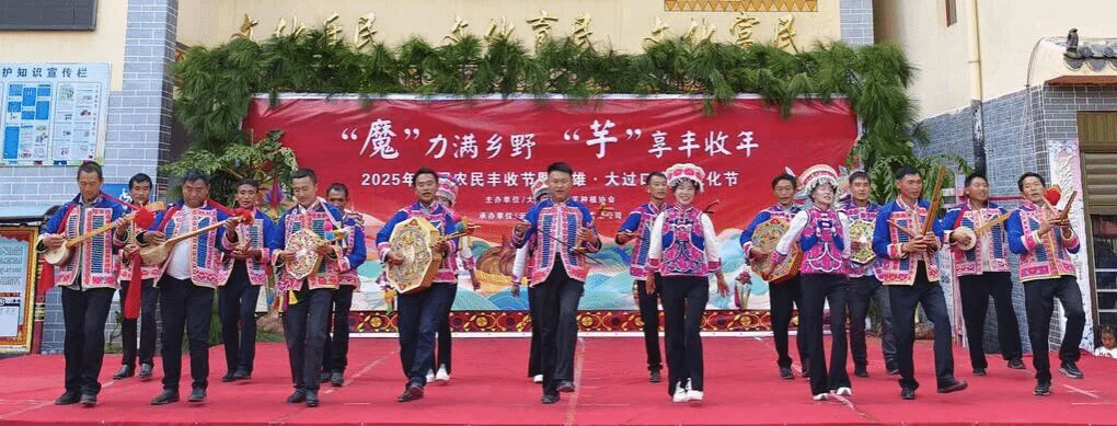“魔”力满乡野,“芋”享丰收年”。当大过口乡的魔芋田翻涌着丰收的金浪,彝族左脚舞的欢快韵律与大三弦的雄浑节拍便在此间交织——10月12日,以“‘魔’力满乡野 ‘芋’享丰收年”为主题的2025年中国农民丰收节暨楚雄•大过口魔芋文化节,在这片沃土上热烈启幕。八方群众共赴这场“以芋为媒”的丰收之约,沉浸式触摸魔芋产业的蓬勃脉动,亲身感受彝族文化的独特魅力,让丰收的喜悦与民族的风情在田间地头尽情绽放。