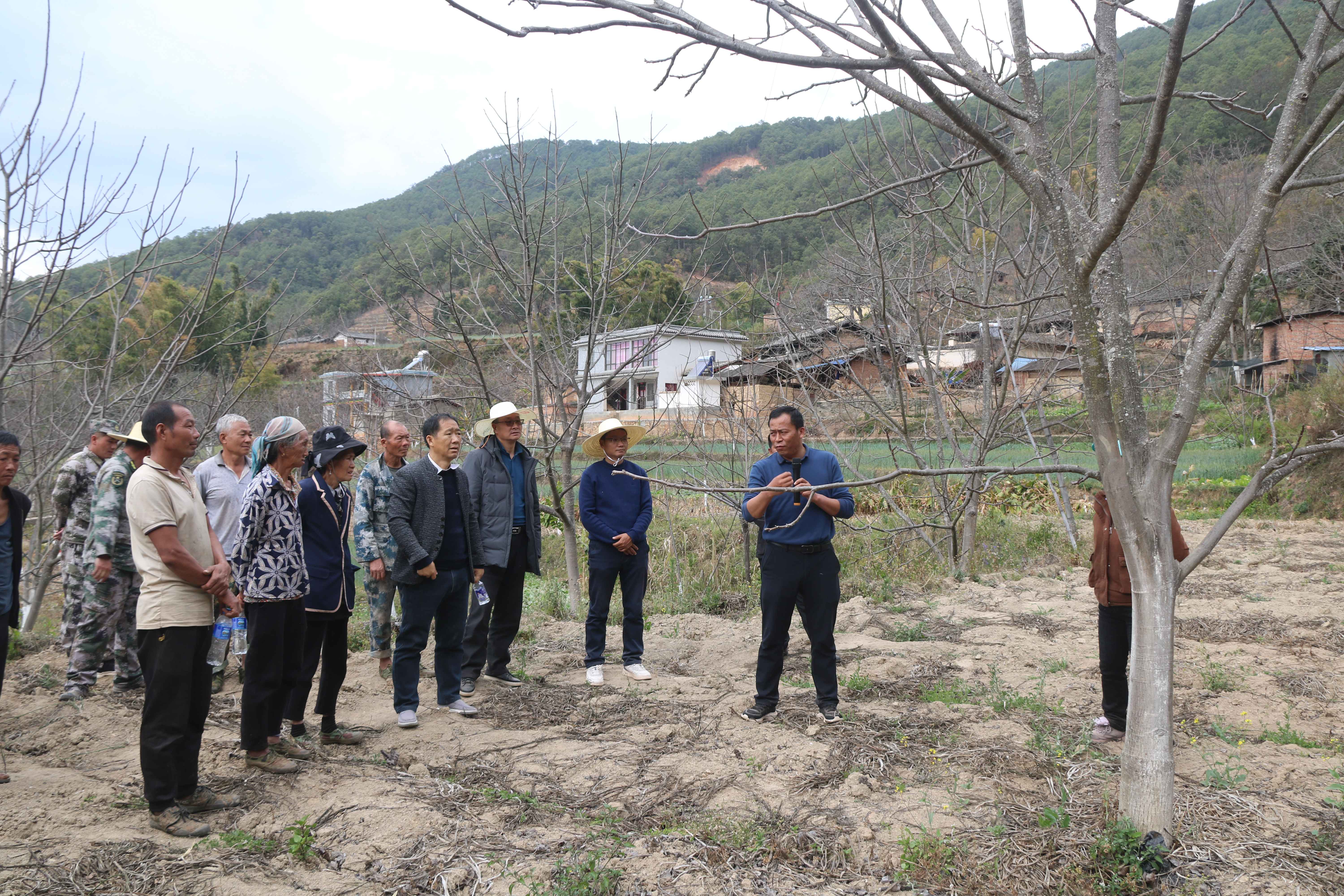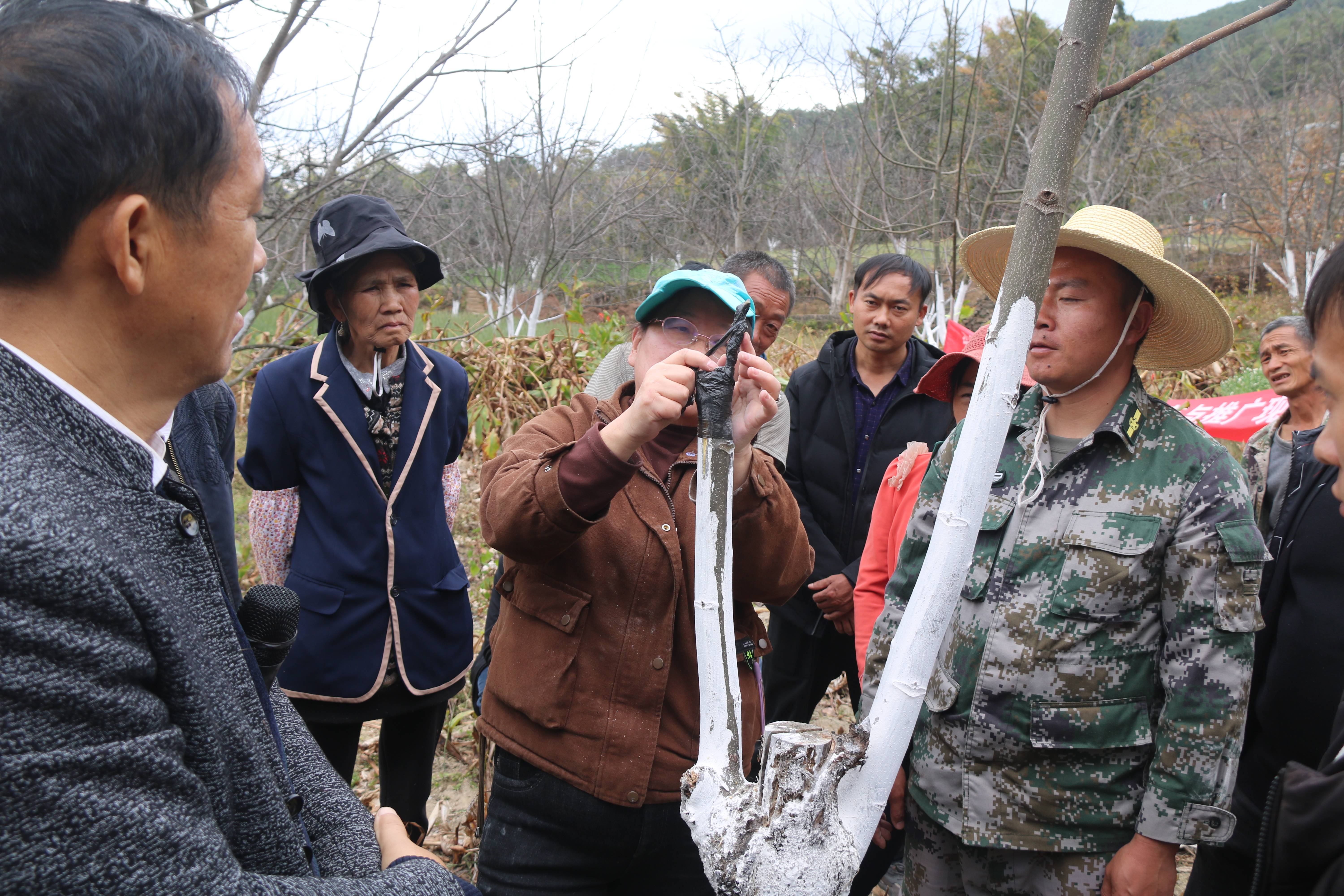 签约仪式结束后,专家组一行到新村镇巨龙村委会大龙潭村民小组开展核桃技术培训会,会上,专家组结合新村镇实际对核桃新品种引进改良嫁接、品种介绍和预期收益情况分析,围绕核桃提质增效、疏密修枝、水肥管理、病虫害防治、实时采收、机械化加工技术等做了系统培训。