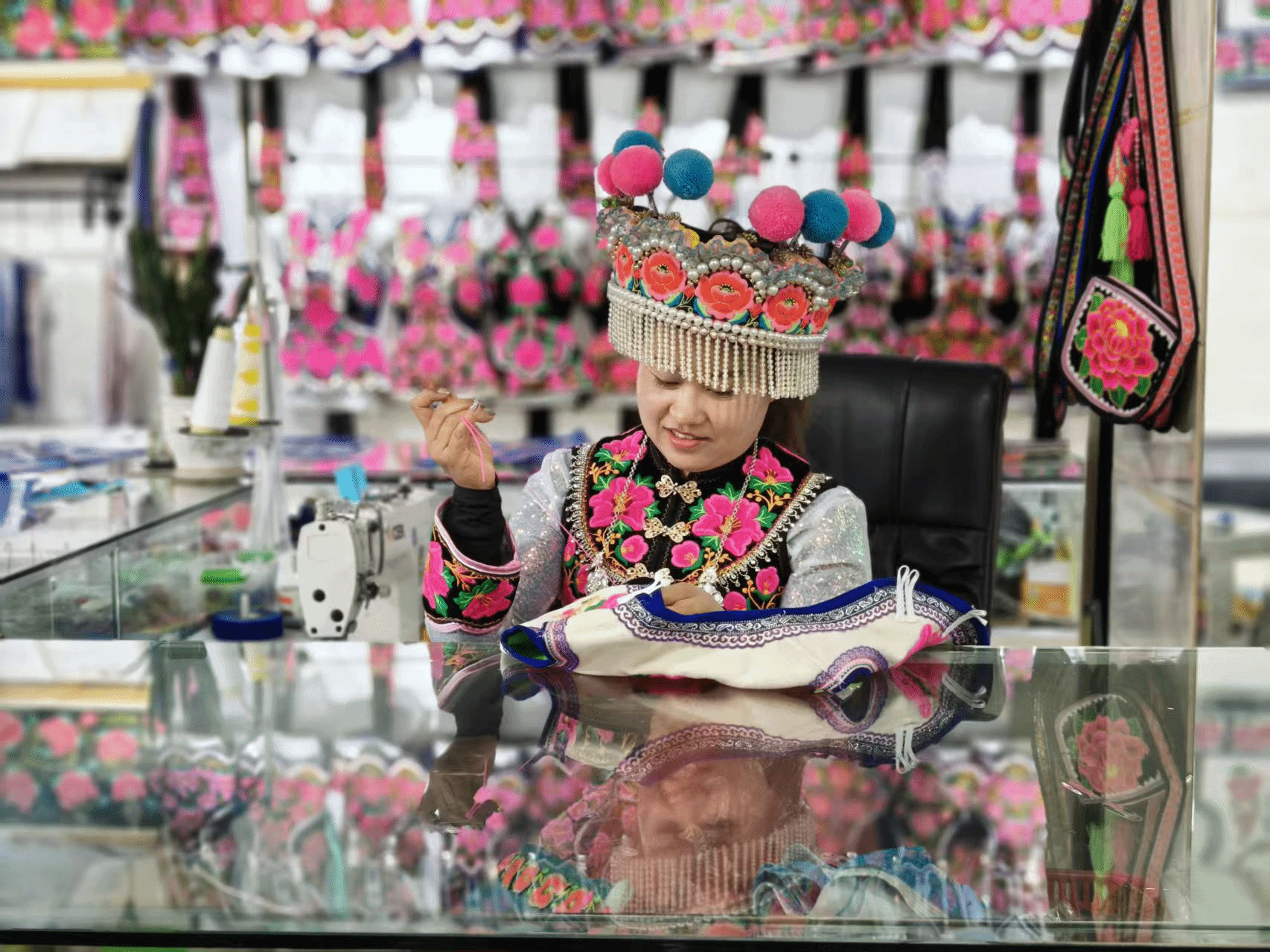 这样的蜕变在大过口乡不在少数。彝花刺绣有限公司把直播间变成彝绣推广的主阵地,2022年单靠直播带货就斩获20余万元收入。乡电子商务服务站组建专业团队,开通4个直播账号,让彝绣与本地野生菌、火腿等特产同台亮相,2024年全乡电商交易额达880万元,其中彝绣线上销售额超200万元,累计卖出绣品4000余件。带着乡土气息的讲解,讲述着纹样背后的彝族故事,让深山彝绣从“养在深闺”变成了全网追捧的“网红好物”。