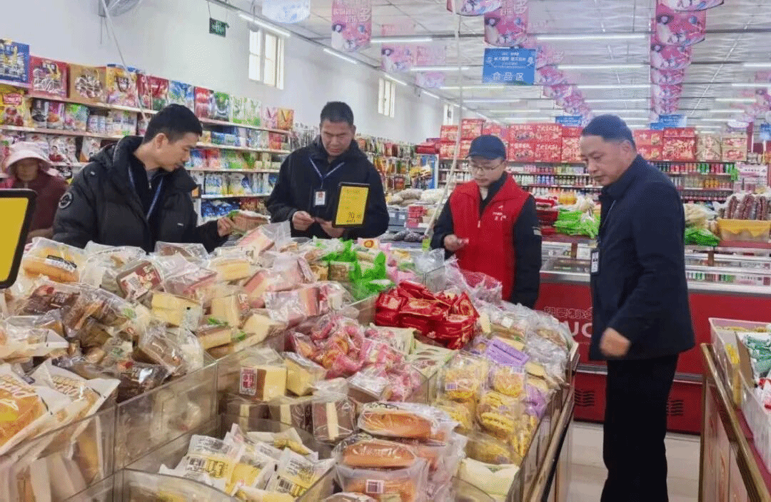 在食品安全检查中,检查组以集市内食品经营摊位、小型超市为核心检查对象,围绕群众节日消费量大的米面油、肉蛋奶、蔬菜水果、节令食品等重点品种,开展全链条排查。执法人员详细查验经营户营业执照、食品经营许可证及从业人员健康证明,仔细核对食品进货台账、索证索票情况,重点检查食品保质期、储存条件及卫生状况,严厉杜绝过期变质、假冒伪劣食品流入市场。