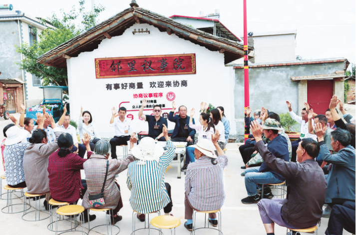 ——党建引领,搭“商平台”。构建以村党总支牵头,党员干部带头,涉事人员与“三代表一委员”参与的协商议事机制。通过把议事会直接开到群众“家门口”,以黄草村委会为试点,打造“邻里议事院”2个,带动全镇8个村,推广166个村民小组设立“邻里议事院”13处,实现“邻里事、邻里议,邻里忧、邻里解,邻里忙、邻里帮”,让基层治理更有活力、更有成效、更有温度。