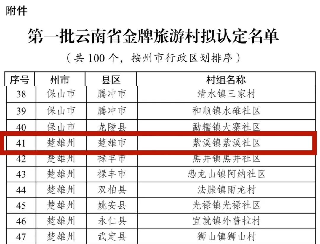 2024年3月11日,云南省文化和旅游厅公示了第一批云南省金牌旅游村拟认定名单。全省共有100个村拟入选,其中,楚雄市紫溪镇紫溪社区上榜!