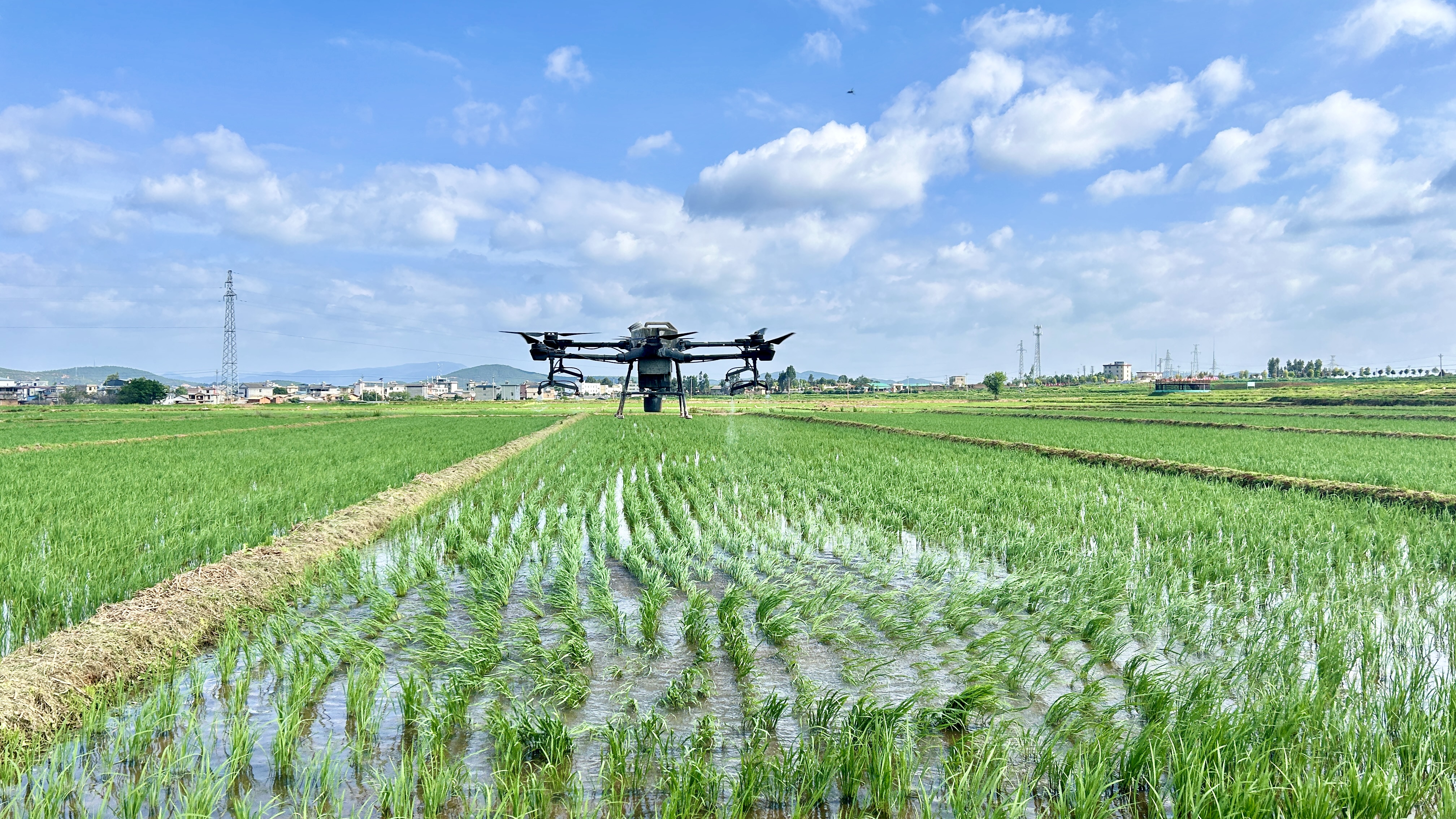 在子午镇法邑村连片稻田中,千亩水稻长势良好,村民王艳仙协助农技人员开展无人机植保,她家里的土地流转给了企业,自己也到基地务工,搭上了集体经济的“快车”。