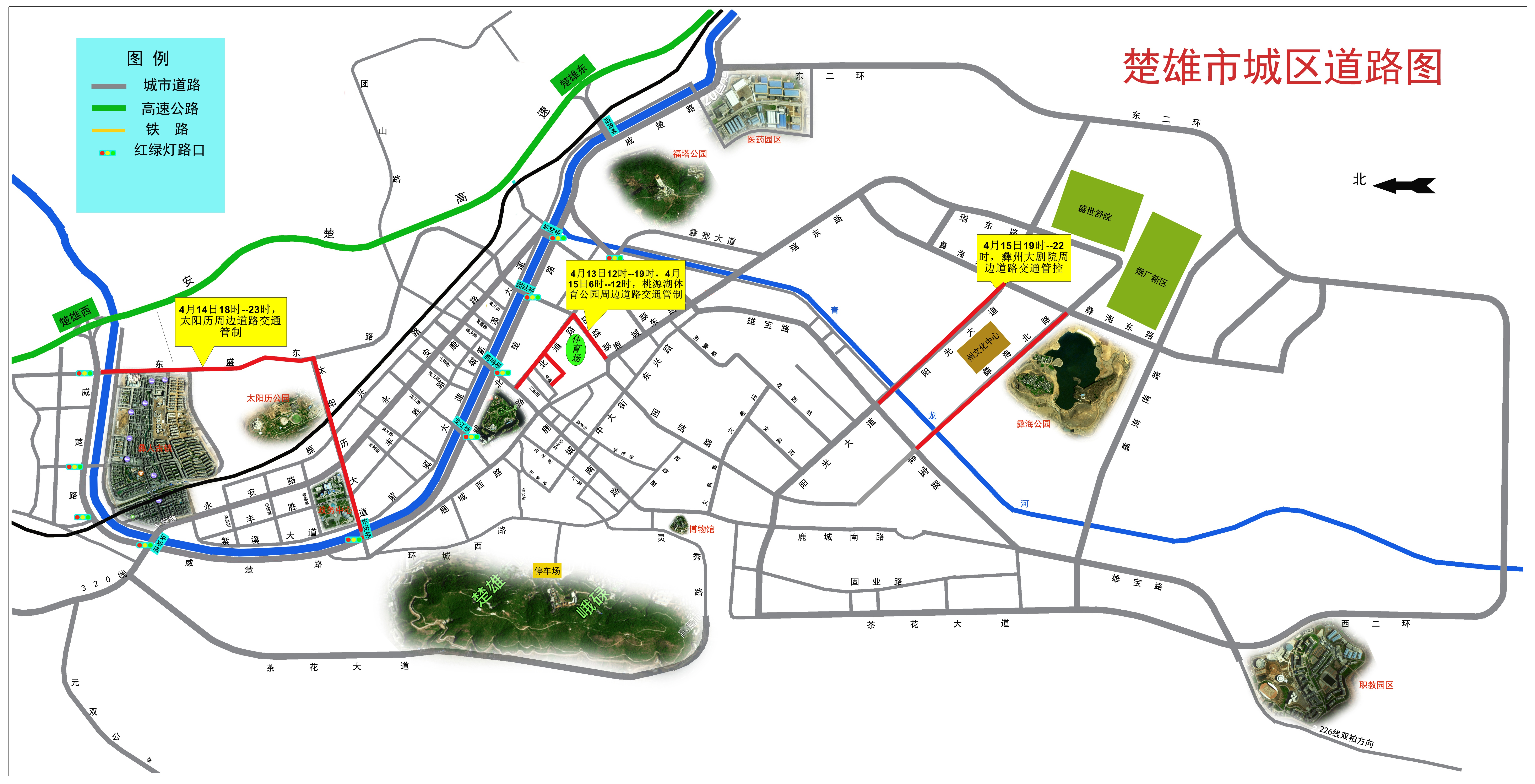 为认真做好楚雄彝族自治州建州60周年系列庆祝活动期间的道路交通管理工作,保障楚雄市城区道路交通安全畅通、文明有序,确保各项庆祝活动顺利举行,依据《中华人民共和国道路交通安全法》及相关规定,决定对楚雄市城区部分道路实施交通管制。现通告如下: