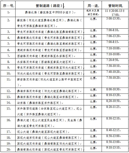 (三)因交通管制对沿线单位、小区及过往车辆、行人带来不便,敬请广大市民予以谅解,提前调整出行时间及路线,服从执勤人员指挥。公安机关交通管理部门将根据比赛进程和现场实际情况,视情况调整交通管制并及时组织恢复交通。