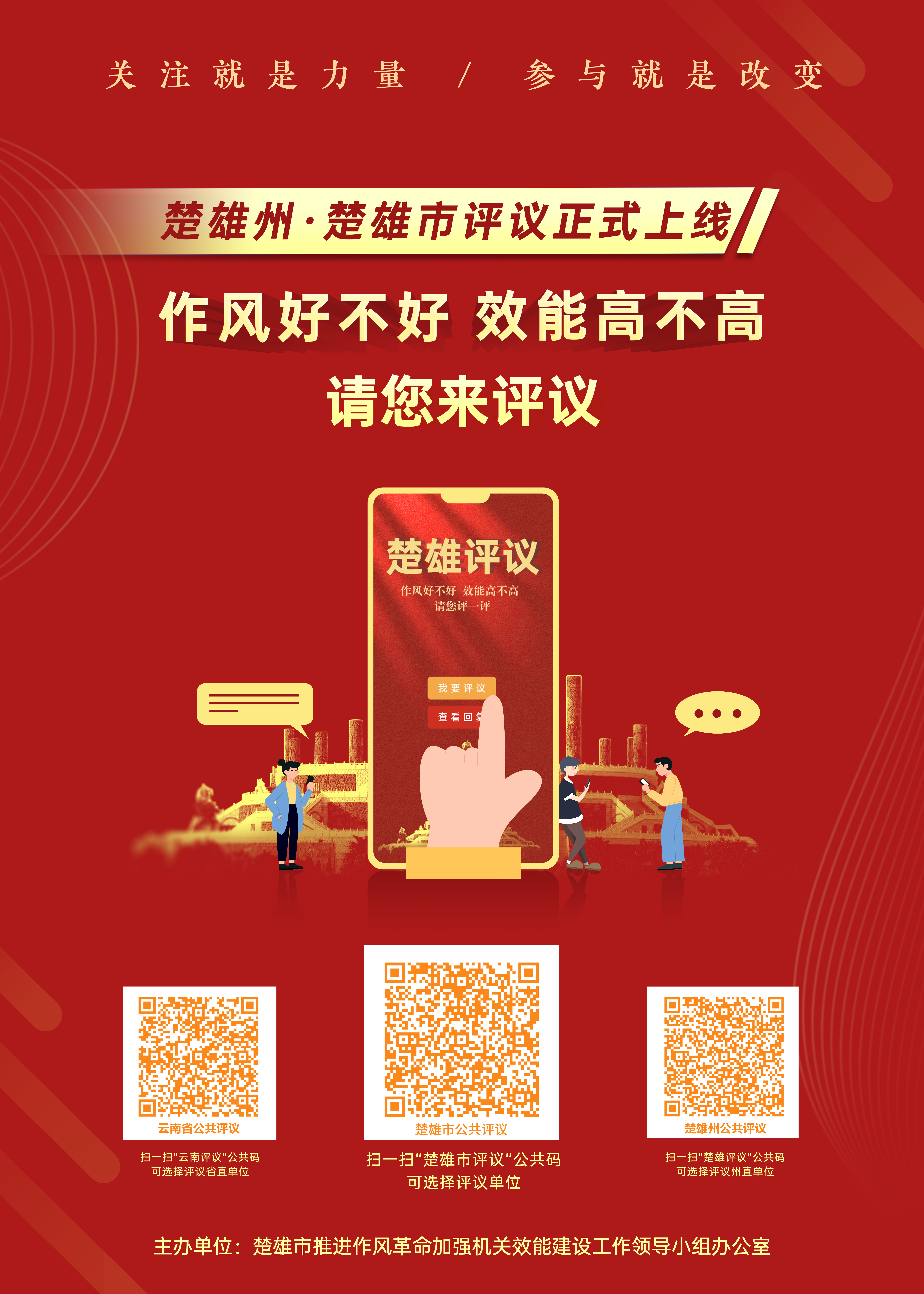 为深入贯彻落实党的二十大关于全面从严治党的战略部署、习近平总书记考察云南重要讲话精神以及省州市党委政府关于推进作风革命效能革命的工作要求,营造良好的干事创业环境,更好地服务群众、服务基层、服务企业,楚雄市群众评议机关作风活动于2024年4月启动,60个单位列入作风评议范围,欢迎社会各界群众对楚雄市机关作风进行评议(名单附后)。您可登录楚雄市人民政府网站、“数字楚雄”微信公众号或在各单位办公楼、办事服务大厅、办事窗口扫描“楚雄州•楚雄市评议”二维码,对机关作风满意度进行评价。如您对作风评议的单位有意见和建议,可通过来信、来电、传真、电子邮件等方式反馈。