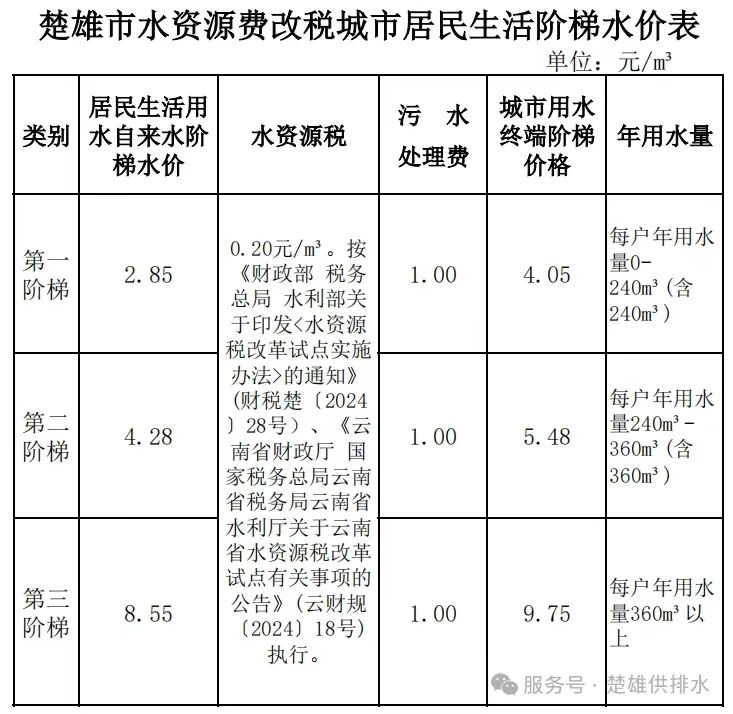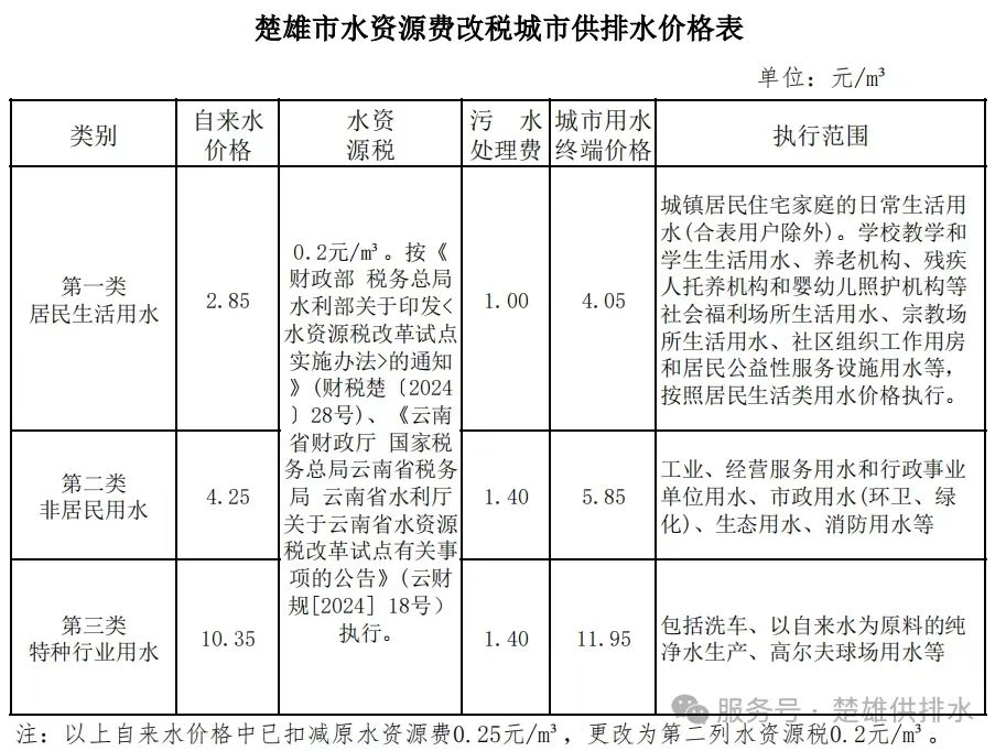 根据《财政部税务总局水利部关于印发<水资源税改革试点实施办法>的通知》(财税楚〔2024〕28号)、《云南省财政厅国家税务总局云南省税务局云南省水利厅关于云南省水资源税改革试点有关事项的公告》(云财规〔2024〕18号)有关水资源费改税的要求,决定扣减楚雄市城市供水价格所含的水资源费0.25元/m3,污水处理费不变。现就有关问题通知如下: