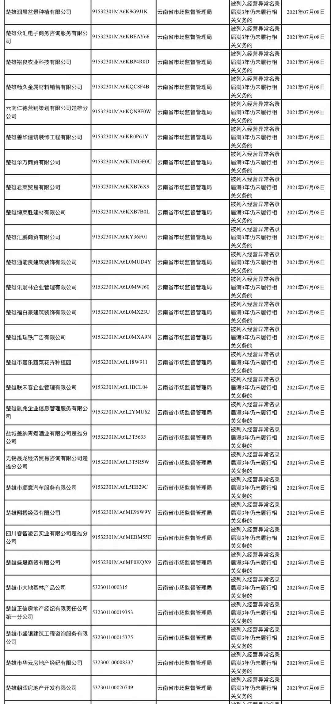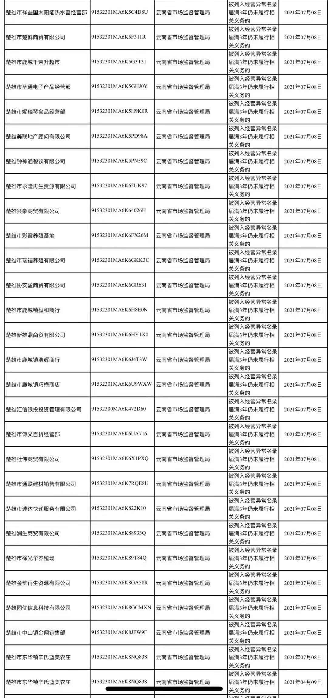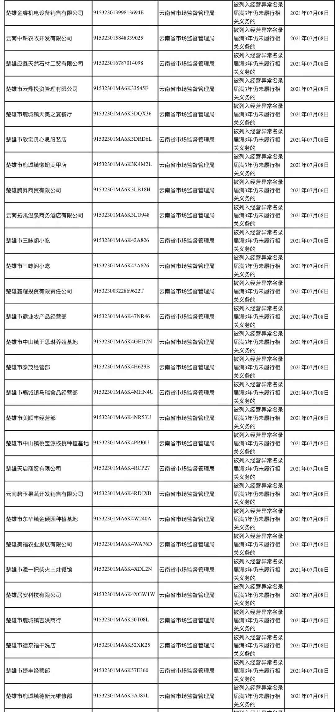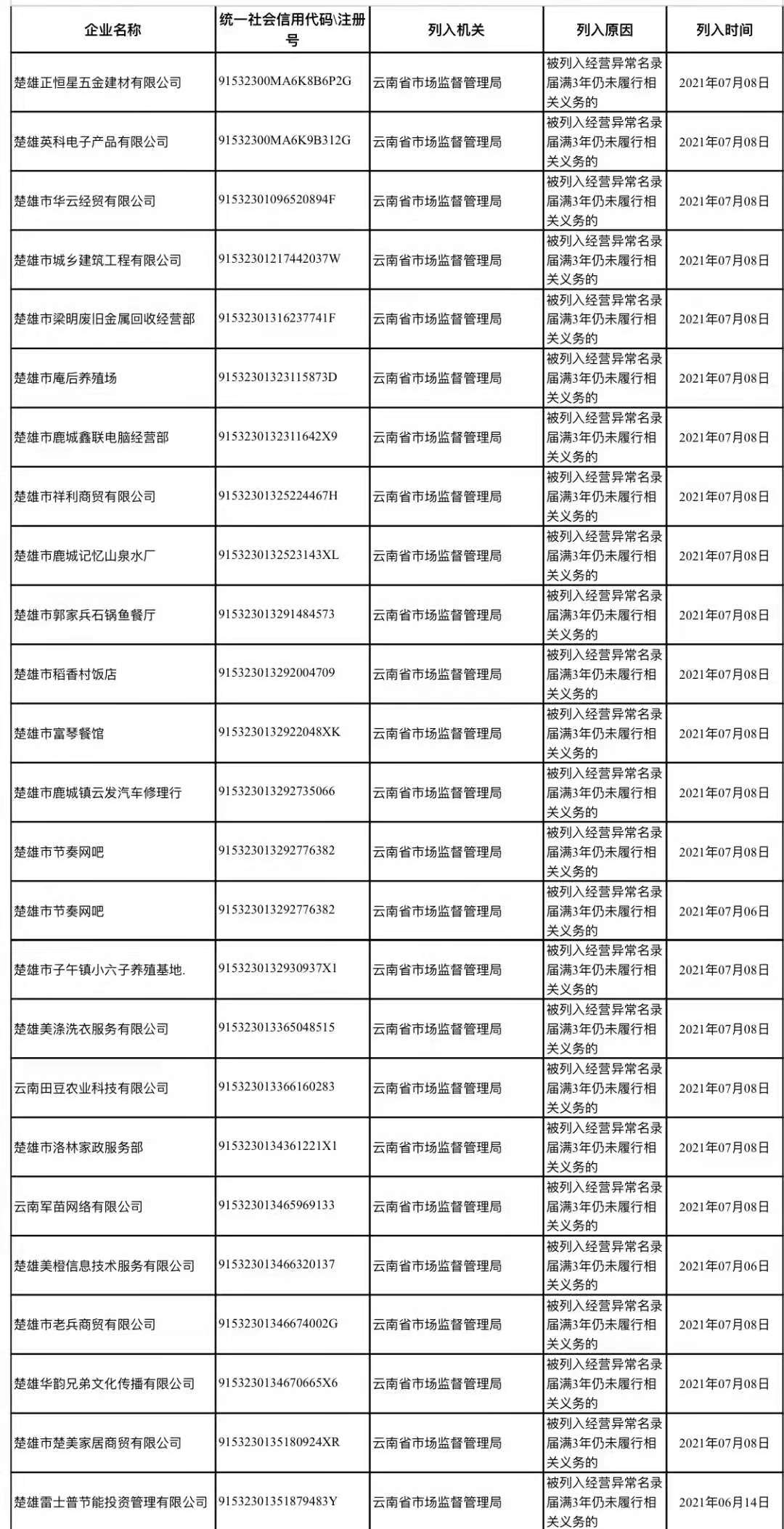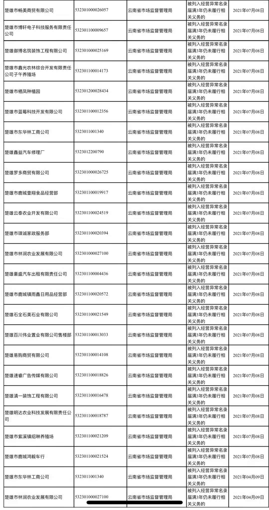 楚雄市市场监督管理局2021年度严重违法失信企业名录 (第一批) (数据截至2021年07月8日)